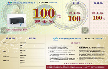 從2011年3月1日起,達科為公司Amaxa轉(zhuǎn)染試劑盒推出送禮活動,凡購買25Test轉(zhuǎn)染試劑盒均贈送一張100元現(xiàn)金券(以此類推,多買多送), 具體使用方法見上圖現(xiàn)金券,咨詢熱線:800 830 4366 電話:0755-26410427 26650164